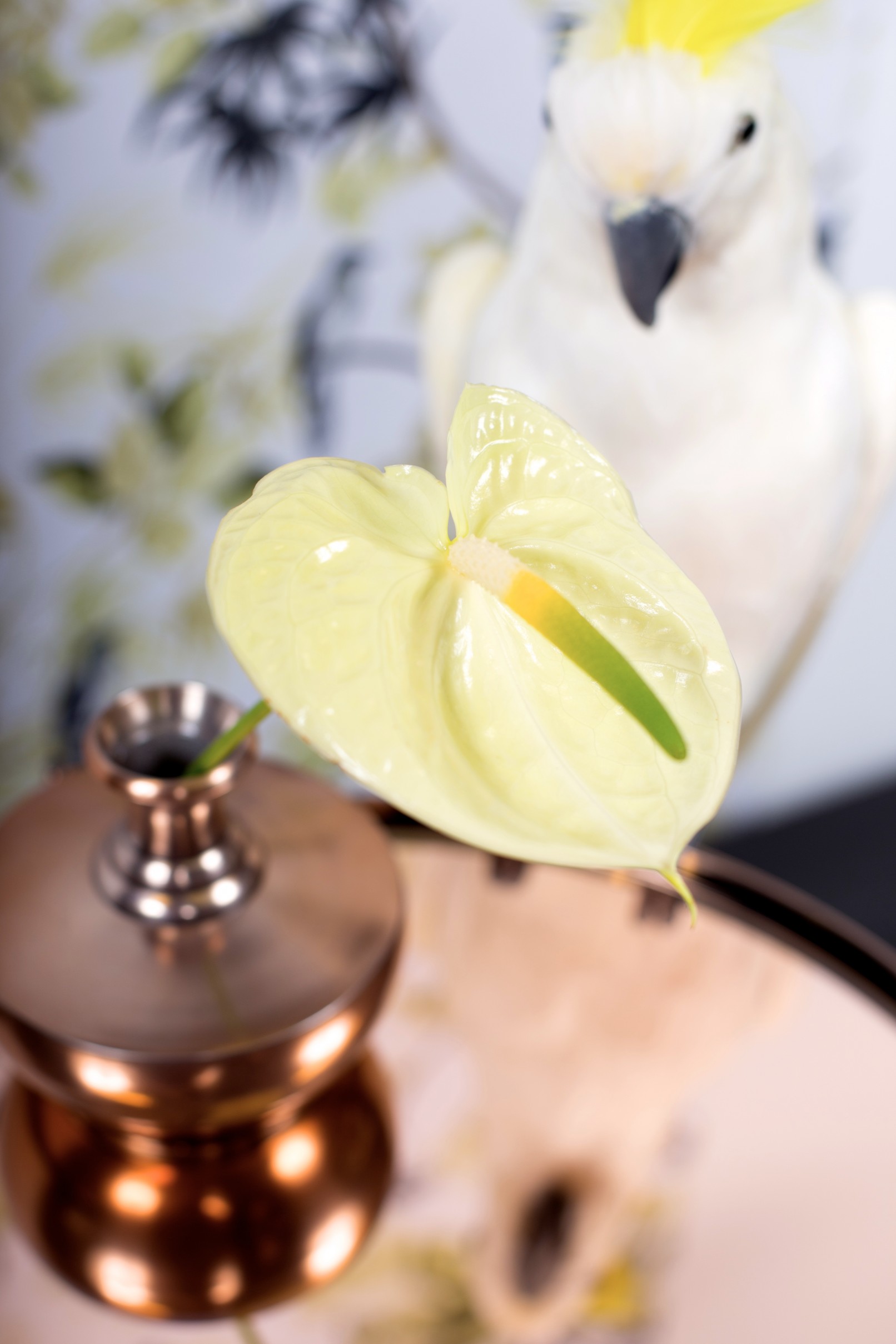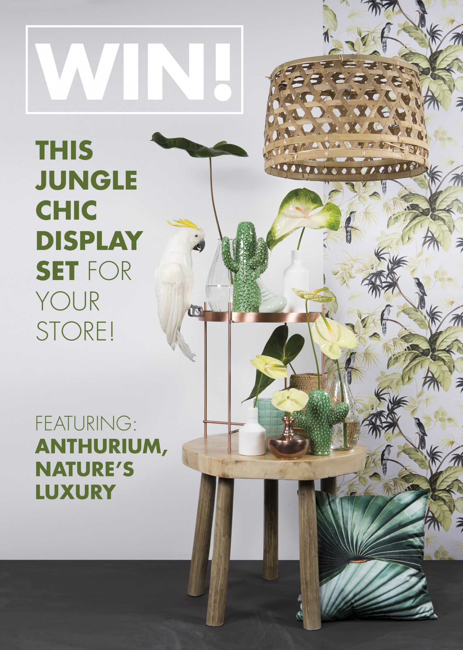 Voor een promotieactie van snijanthurium stelde ik een winkeldisplay samen in het thema JUNGLE CHIC. De display is bedoeld om te gebruiken in de etalage of winkelpresentatie van een bloemenwinkel om de snijanthurium van zijn mooiste kant en volgens de laatste trends te laten zien. Door gebruik te maken van verschillende interieurelementen is de display flexibel en kan hij snel en gemakkelijk op verschillende manieren neergezet worden. De display versterkt de eigenschappen van anthurium; natuurlijke glans, bijzondere vormen en diversiteit.